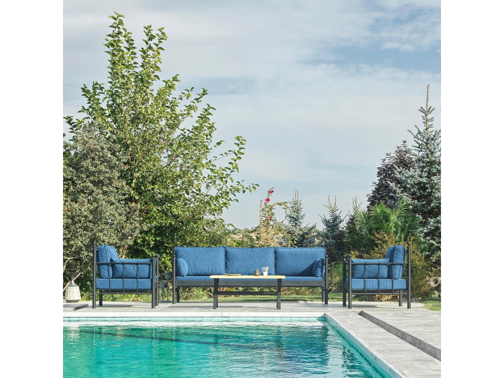 Zahradní nábytek s kovovým rámem obsahuje pohodnou pohovku s lepenými lamelami na které se, díky její velikosti, posadí tři dospělí, nebo si na ní můžete pohodlně poležet. Dvě křesla s lamelami a pohodlnými polštáři a konferenční stolek s kovovou konstrukcí.