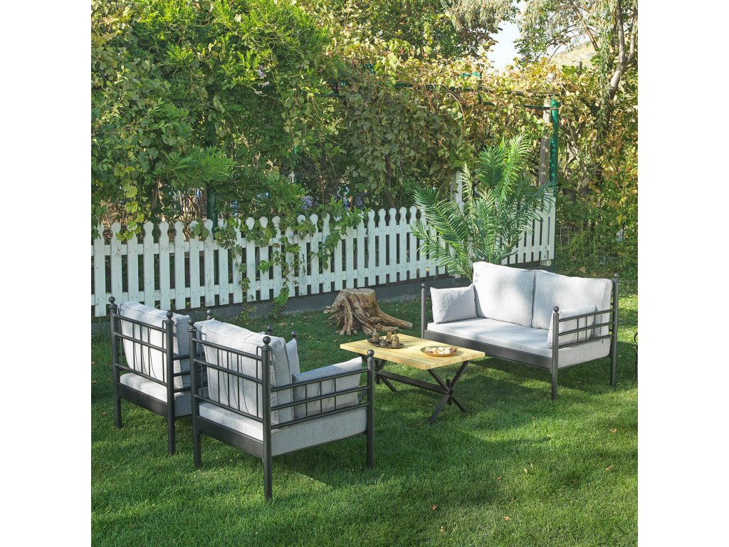 Pevný a stabilní kovový rám ošetřený práškovým lakováním, lepené lamely pro extra pohodlí a bohatě polstrované polštáře, dodávají zahradnímu setu vlastnosti luxusního nábytku na zahradu.