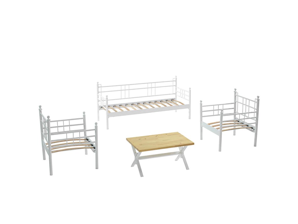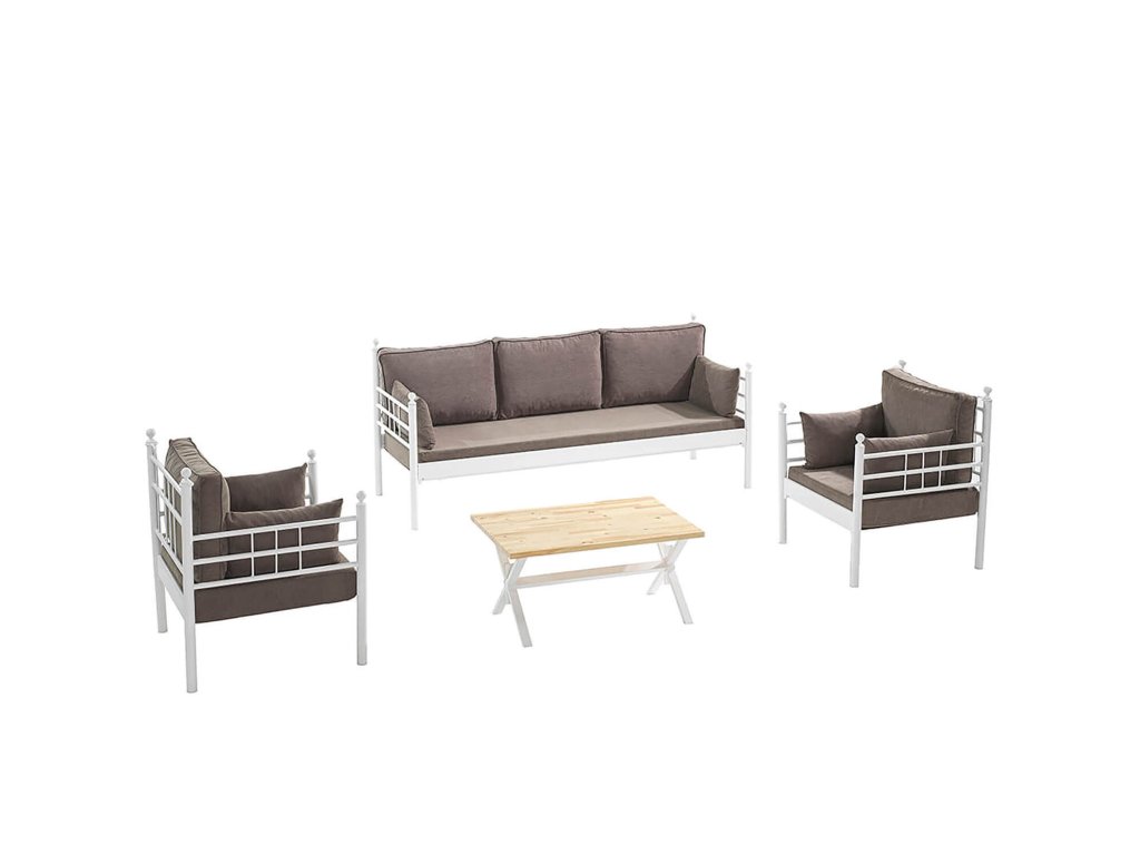 Set obsahuje velkou pohovku na které se pohodlně usadí tři dospělí, nebo si na ní můžete i poležet. Dvě extra pohodlná křesla s opěrkami a měkkými polštáři a konferenční stolek s kovovou konstrukcí a luxusní deskou.