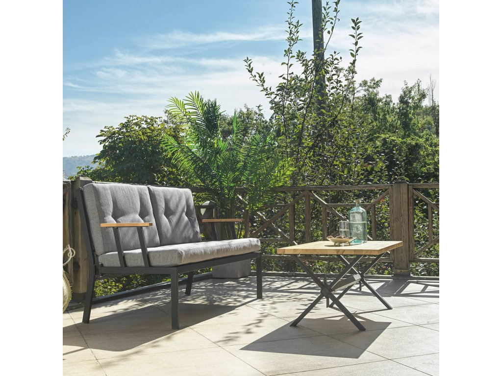 Dvoumístná sklopná zahradní pohovka LOTUS může stát na terase, nebo v zimní zahradě, je odolná vůči korozi a má odnímatelné polstrování.
